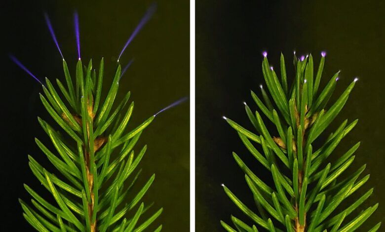 به گزارش خبرآنلاین، این درخشش آبی رنگ نتیجه تخلیههای الکتریکی ضعیفی (که «coronae» نامیده میشود) است که در بالای تاج درختان ایجاد میشود.